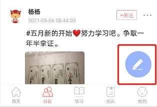右下角的蓝色半透明按钮,点击进入“发表动态”页面,在这里你可以发布你的学习心得,也可以发表学习中遇到的问题求助小伙伴。