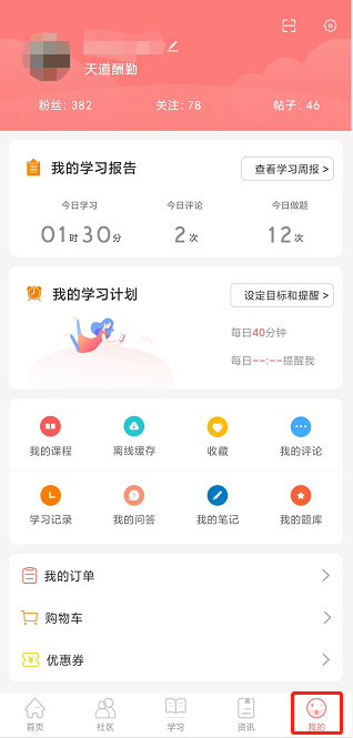 点击【我的】进入个人中心,这里囊括了你在学习路上所需要用到的功能。