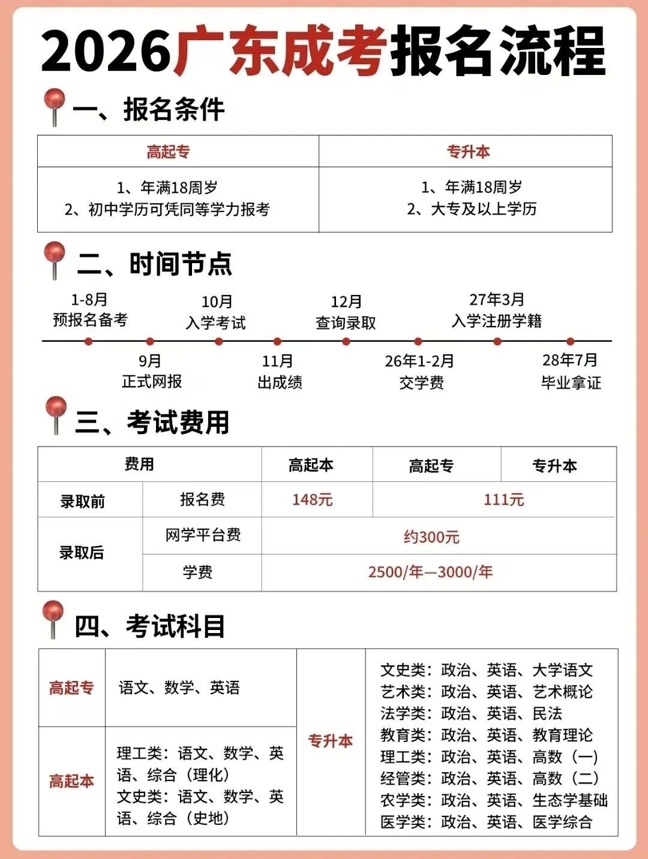 。对于想要提升学历的社会人员来说,成人高考入学和毕业难度适中,是性价比极高的选择。本文整理了2026年广东成人高考重要信息,帮你轻松理清报考全流程