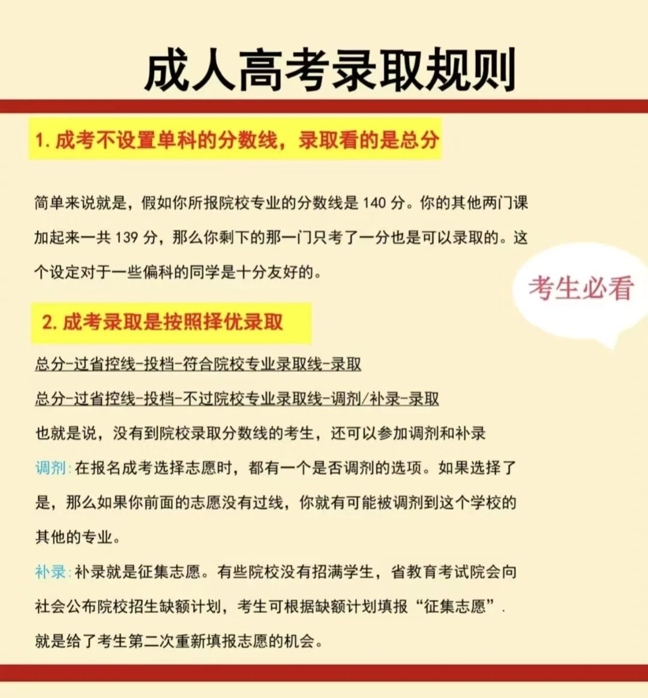 广东成考录取实行“从高分到低分择优录取”原则,核心亮点是“只看总分,不设单科线”。比如你擅长语文和英语,数学稍弱,就可以重点突破优势科目,把总分提上去,只要总分达到报考院校专业的录取分数线,就能顺利被录取,不用纠结某一门的分数。