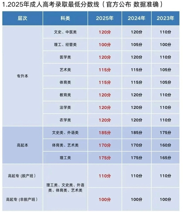理工类、文史类、外语类、体育类、艺术类均为110分非脱产班:理工类、文史类、外语类、体育类、艺术类均为100分