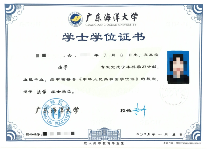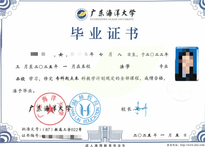 凡被正式录取的考生,通过入学资格审查,正式注册入学后,按规定修完人才培养方案规定的课程,经考核成绩合格,获得相应的学分,由我校颁发相应学历的毕业证书,国家承认学历。符合广东海洋大学成人高等教育本科毕业生学士学位条件者,授予学士学位。