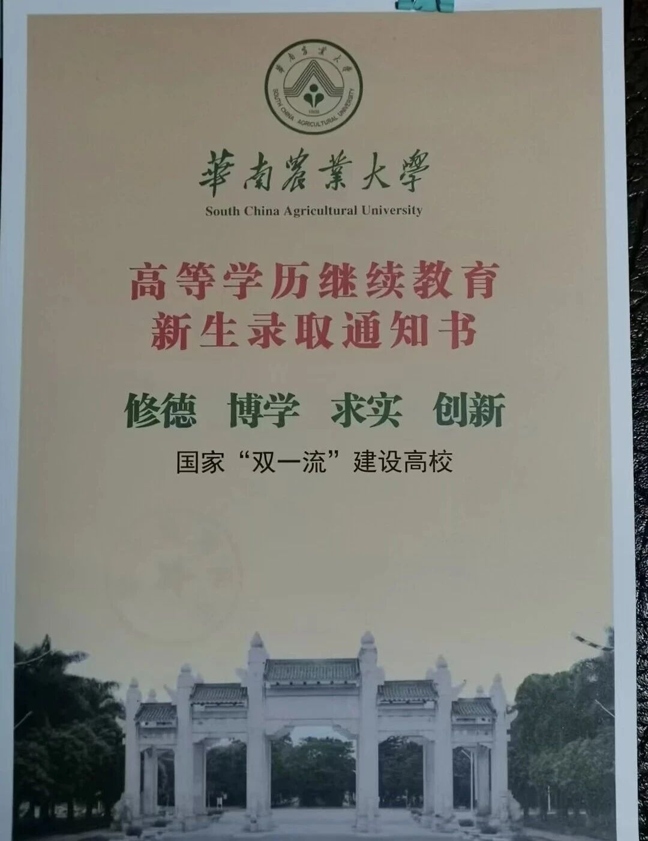 华南农业大学成人高考录取通知书通常在12月末至次年1月陆续发放。具体时间以学校或教学点通知为准,建议关注华南农业大学继续教育学院官方公众号“华南农大继教”或联系教学点班主任获取最新信息。