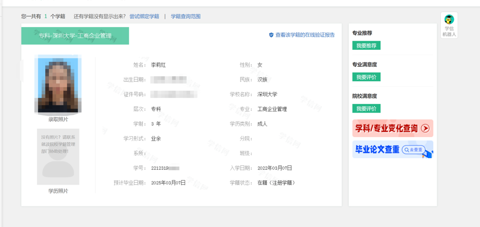 学籍信息需与本人实际信息一致,若发现错误请及时联系学校学籍管理部门。