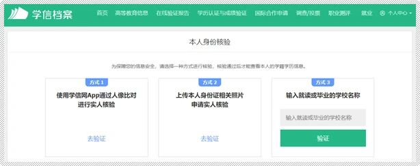 可通过3种方式完成本人身份核验,验证通过后就可以查询本人学籍学历信息。