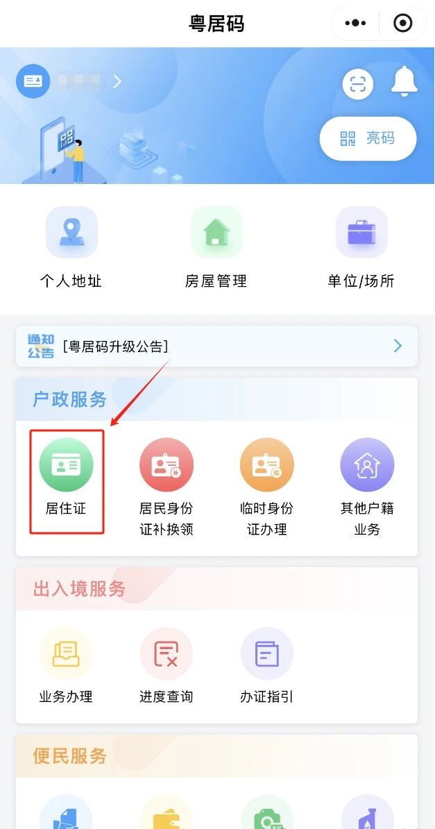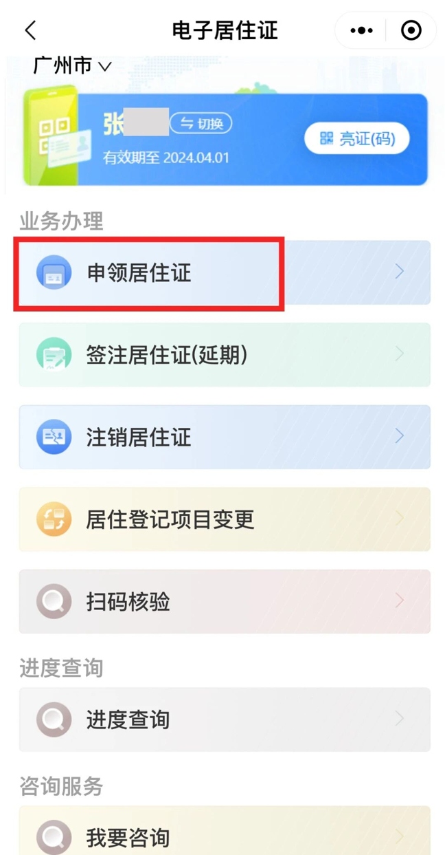 01.粤居码小程序点击“申领居住证”