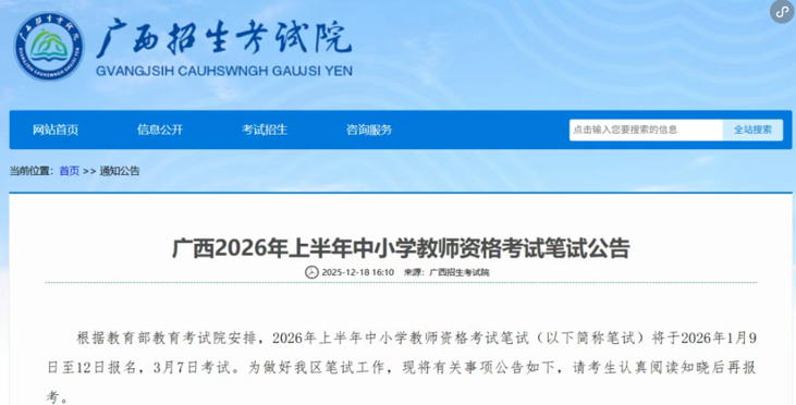 【通知】广西率先发布,2026年上半年中小学教师资格考试笔试公告!