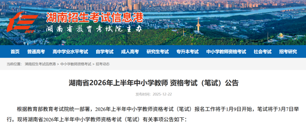 根据教育部教育考试院统一部署,2026年上半年中小学教师资格考试(笔试)报名工作将于1月9日开始,笔试将于3月7日举行。现将湖南省2026年上半年中小学教师资格考试(笔试)有关事项公告如下: