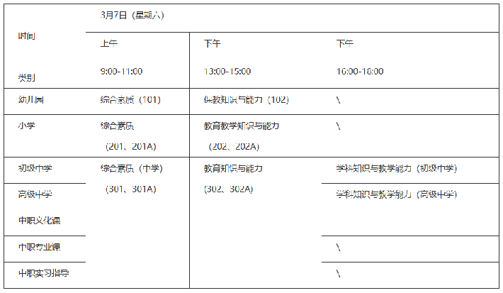 (五)全国统一考试时间为3月7日,各类别考试科目与时间安排如下: