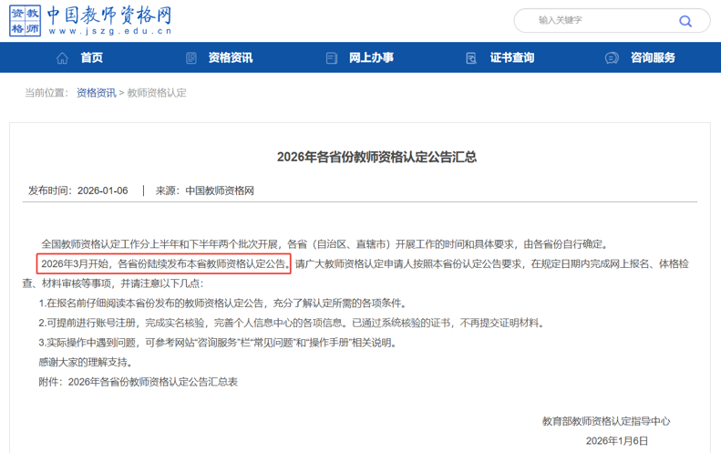 2026年3月开始,各省份陆续发布本省教师资格认定公告。