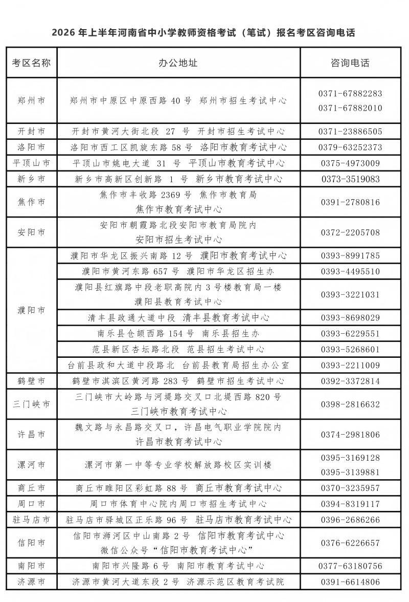 中小学教师资格考试(笔试)各考区相关联系方式见下表: