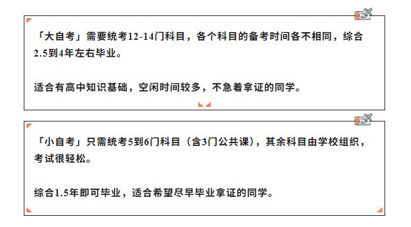 小自考仅需参加5-6门统考科目(其中包含3门公共课),剩余科目由主考院校自主命题并组织校考,考核难度相对较低、通过率更高,整体1.5年左右即可完成学业并毕业。该形式适配基础薄弱、备考时间有限、希望尽早拿证的考生,能借助校考优势缩短备考周期,快速实现学历提升目标。