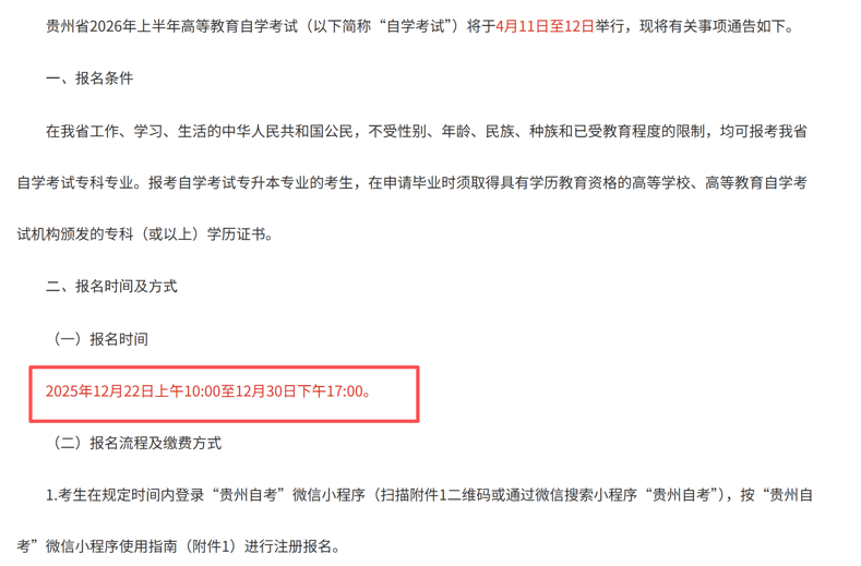贵州省招生考试院关于2026年上半年高等教育自学考试报名的通告!