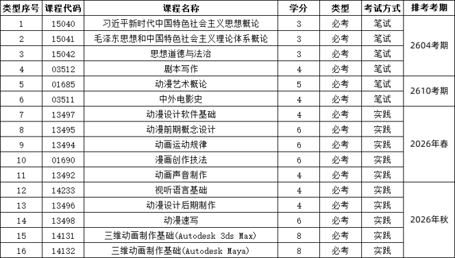 2026年1月考期已经报考完毕,接下来就是四月和十月的考试,笔试统考的科目具体如下,实践考核的安排一年是有2次,分别是2026年春和2026年秋,一般是由有院校合作资质的教学点来组织考试。每次最多可以报考5个科目!