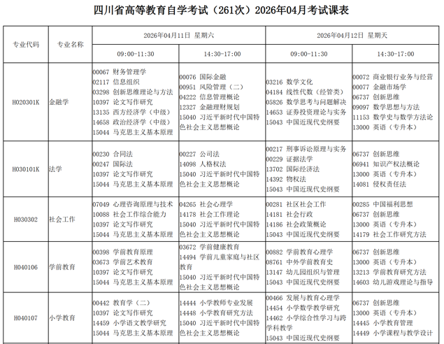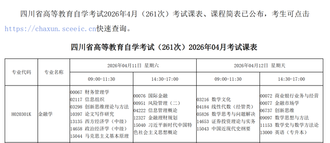 【图】四川省自学考试2026年4月(261次)考试课表、课程简表已发布!