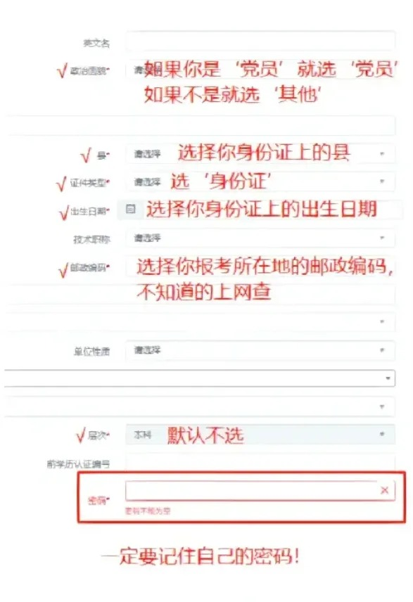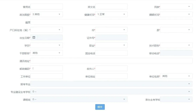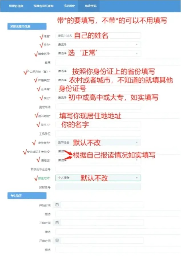 3、进入之后按照要求填写详细的个人信息后【提交】,保存好【预报名号】【密码】,填写信息内容较多。考生可以参考小编的模版填写,个人信息如实填写即可,其中带*为必填项,不带*号键可不填。(仅供参考)