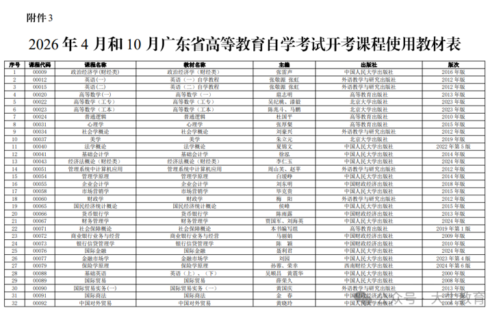 由于篇幅有限,需要完整版2026年4月和10月广东省高等教育自学考试开考课程使用教材表同学,可以进入我们公众号,然后在公众号后台回复【自考教材】获取↓↓↓