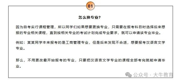 在换专业时,你并不用办理什么手续,可以直接根据新专业(你要换的专业)的课程设置报考就可以了,而且