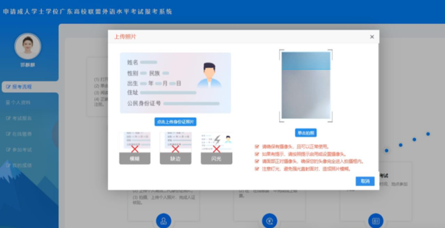 2、通过摄像头进行系统现场拍照作人脸验证,系统将自动核验考生信息(如审核不通过,重新调整坐姿进行现场拍照)。