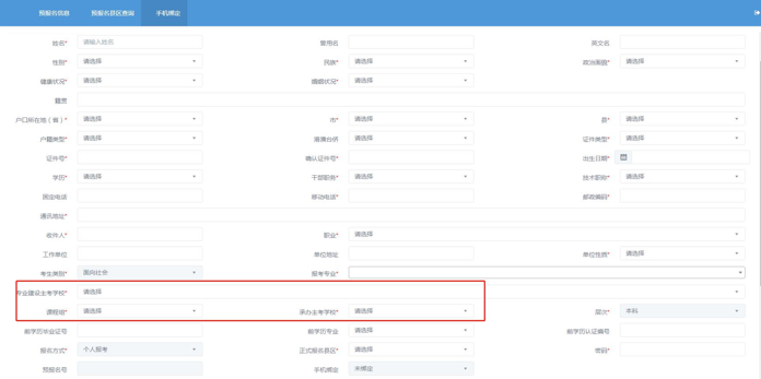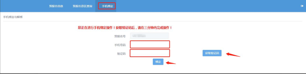 确认预报名号码无误后,填写手机号码,点击获取验证码并填写,最后点击绑定