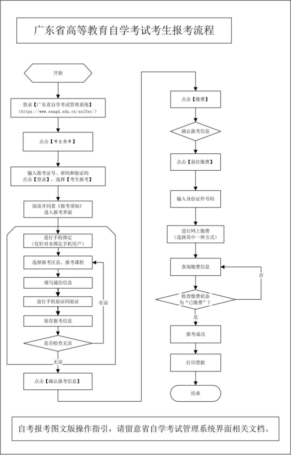 进入广东省自学考试管理系统→新生注册点击“考生预报名”按钮→按提示填写考生姓名、报考专业等基本信息→采集照片→考生新生进入报考→选择“考试县区”→输入报考科目→保持报考信息→确认报考信息→缴费→查询缴费信息。