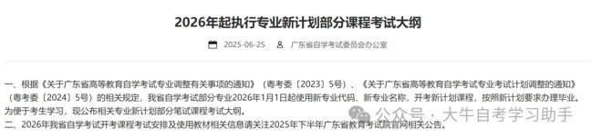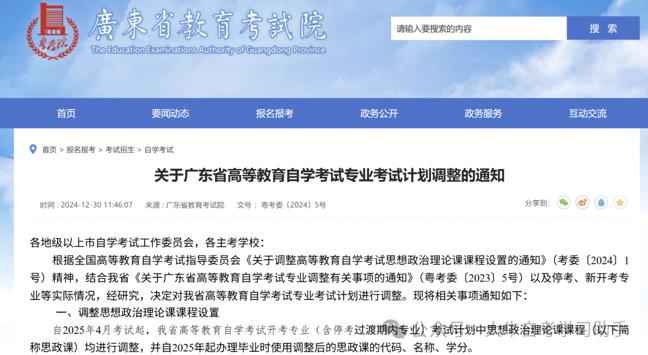 2024年12月30日,广东省教育考试院又发布了关于广东省高等教育自学考试专业调整有关事项的通知。对相关专业和专业代码等进行了更新调整。