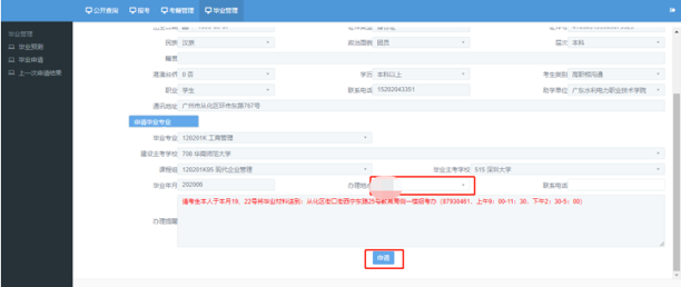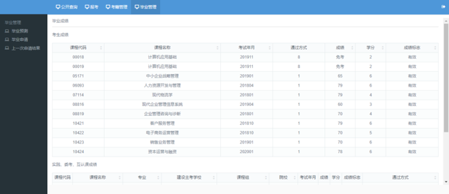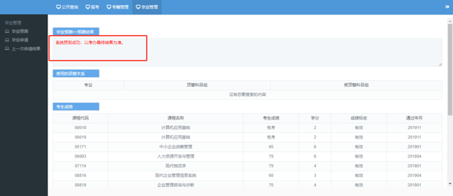 2、登录后,点击“毕业管理”--“毕业预测”--选择毕业专业以及学校,查看是否已经考完所有科目