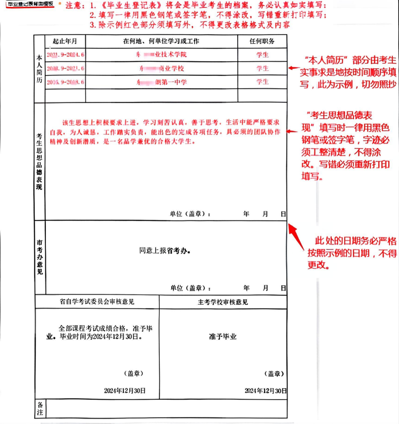 ③ 认真核对个人信息,并用黑色笔填写简历栏(可填写初中、高中、专科、本科阶段)。