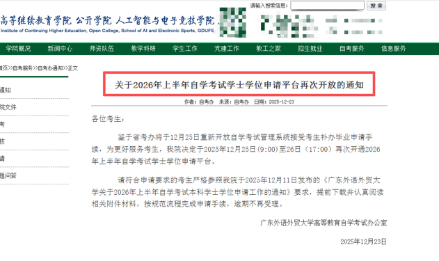 鉴于省考办将于12月25日重新开放自学考试管理系统接受考生补办毕业申请手续,为更好服务考生,广东外语外贸大学继续教育学院决定于2025年12月25日(9:00)至26日(17:00)再次开通2026年上半年自学考试学士学位申请平台。