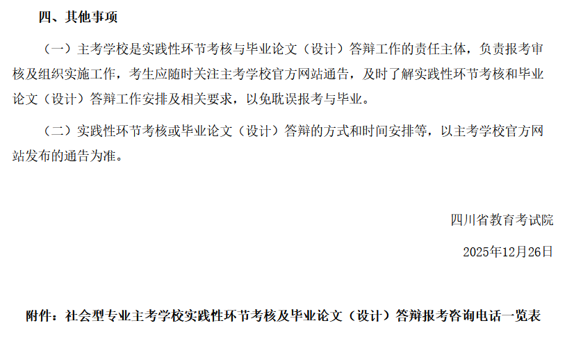 通知:四川省2026上半年自考实践性环节考核和毕业论文(设计)答辩1月4日报名