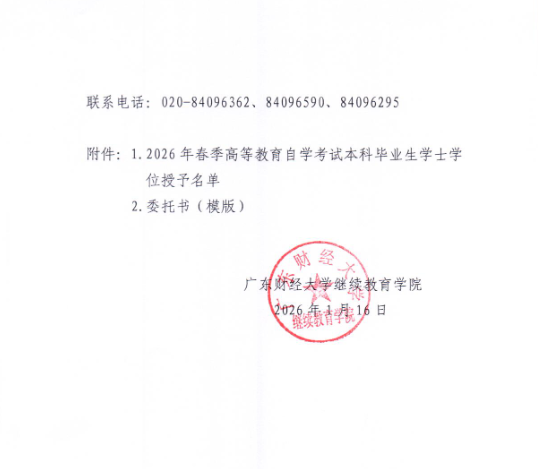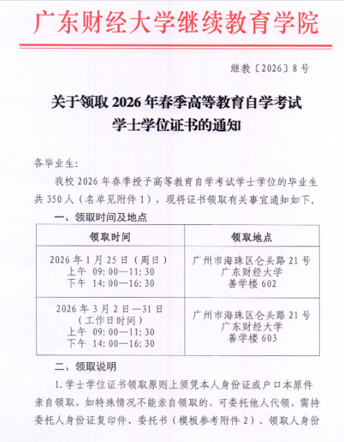 关于领取广东财经大学2026年春季高等教育自学考试学士学位证书的通知