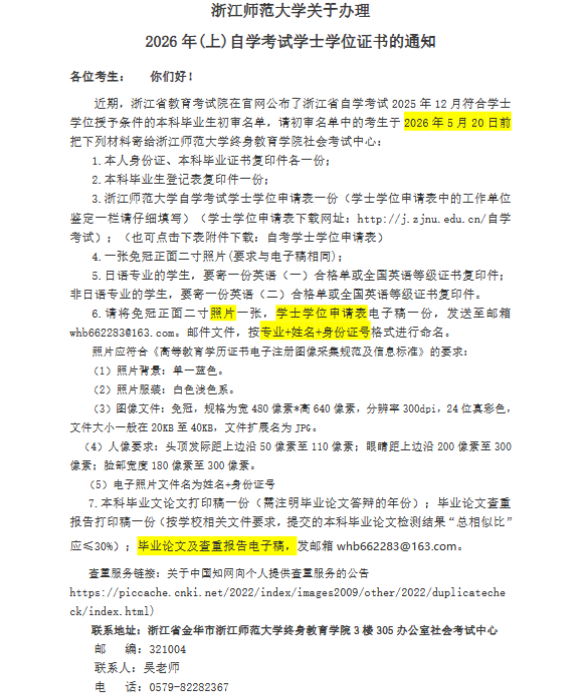 浙江师范大学关于办理2026年(上)自学考试学士学位证书的通知