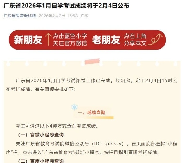 广东省清远市2026年1月自学考试评卷工作已完成。经研究,将在2月4日15时公布考试成绩,有关事项安排如下: