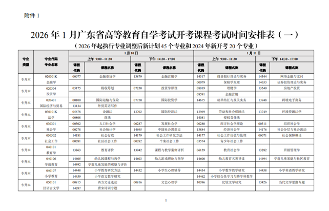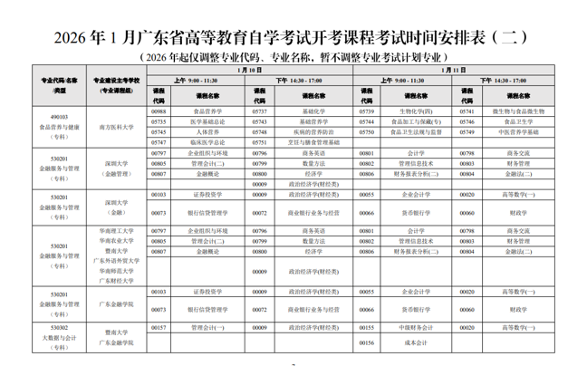 | 2026年1月广东自考考试时间安排 | ||