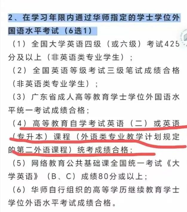 | 华南农业大学 | 1.参加成人学士学位广东高校联盟外语水平考试,成绩合格。2.参加全国英语等级考试(PETS)三级或以上,笔试成绩合格。3.参加全国大学英语四级(CET-4)或以上,成绩≥425分。4.参加广东省成人高等教育学士学位外国语水平全省统一考试,成绩合格。5.高等教育自学考试英语(二)或英语(专升本)课程统考成绩合格。 |