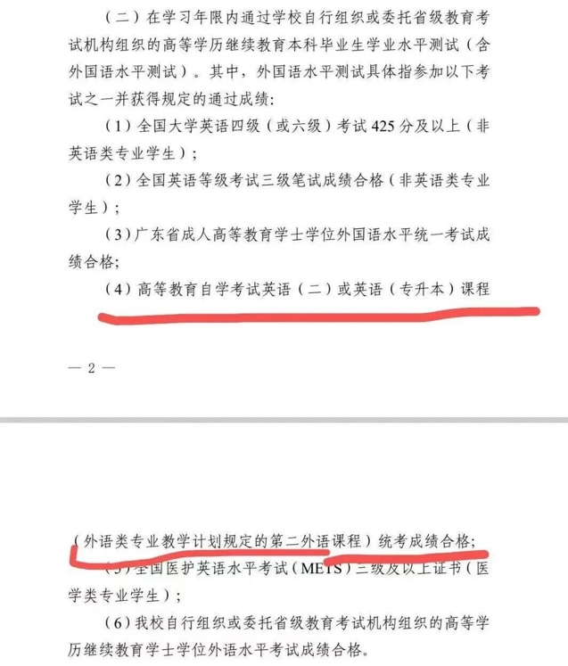 | 汕头大学 | 1.参加全国大学英语四级(CET-4)或六级(CET-6),成绩≥425分。2.参加全国英语等级考试(PETS)三级,笔试成绩合格。3.参加广东省成人高等教育学士学位外国语水平统一考试,成绩合格。4.高等教育自学考试英语(二)或英语(专升本)课程统考成绩合格。5.(医学类专业)参加全国医护英语水平考试(METS),获三级及以上证书。6.参加汕头大学自行组织或委托组织的学位外语水平考试,成绩合格。 |