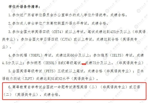 | 暨南大学 | 1.参加广东省学位委员会办公室举办的成人学位外语统考,成绩合格。2.参加成人学士学位广东高校联盟外语水平考试,成绩合格。3.(非英语专业)参加全国大学英语四级(CET-4)或以上,笔试成绩>425分(英语专业)参加全国大学日语四级(CIT-4)或以上,成绩合格。4.(非英语专业)参加托福(TOEFL)、雅思(IELTS)、朗思(IESOL)等考试,达到相应成绩要求。5.参加全国英语等级考试(PETS)三级或以上笔试合格;或日本语能力测试(JLPT)N1/N2(英语类专业)。6.高等教育自学考试英语(二)(非英语类专业)或日语(二)(英语类专业)统考成绩合格。 |
