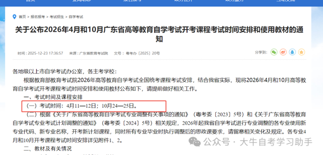 根据广东省教育考试院及广州招考的通知,2026年10月广东高等教育自学考试时间已基本确定,考生可提前锁定关键节点,精准规划备考节奏!