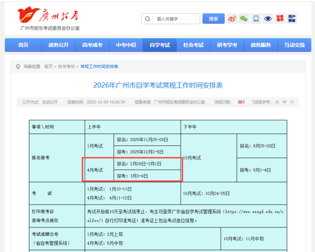 2026年广东4月自学考试时间已经确定了,4月考期将于4月11-12日举行,报名时间广东教育考试院暂未官宣,根据广州招考公布的2026年广州自学考试常规工作时间安排表,预计在2月下旬开始报名报考。
